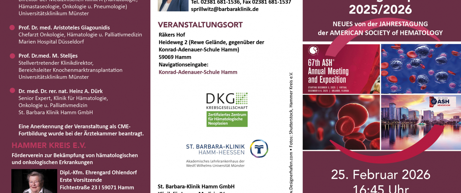 Unterteilt in die Themenbereiche „Aggressive Lymphome – „Akute Leukämien und Zelltherapie“ – „Multiples Myelom“ – „Myelodysplastische Neoplasien“ – sowie „Chronisch Lymphatische Leukämie“ werden Ihnen die Referenten in Impulsvorträgen innovative und versorgungsrelevante Daten vorstellen, die im Dezember 2025 bei der 67. Jahrestagung der Amerikanischen Gesellschaft für Hämatologie (ASH) in Orlando diskutiert wurden. Wie bereits in den letzten Jahren rücken die bispezifischen Antikörper- und die CAR-T Zell–Therapien in frühe Therapielinien vor.