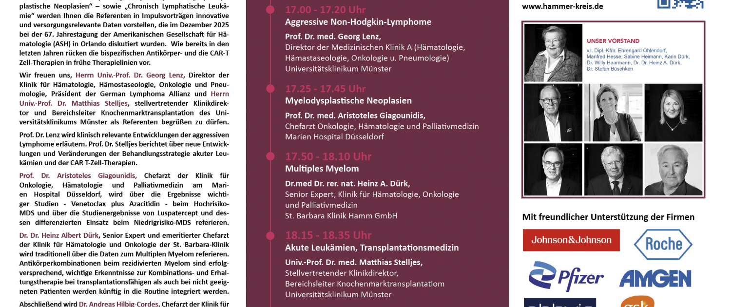 Wir freuen uns, Herrn Univ.–Prof. Dr. Georg Lenz, Direktor der Klinik für Hämatologie, Hämostaseologie, Onkologie und Pneumologie, Präsident der German Lymphoma Allianz und Herrn Univ.-Prof. Dr. Matthias Stelljes, stellvertretender Klinikdirektor und Bereichsleiter Knochenmarktransplantation des Universitätsklinikums Müns ter als Referenten begrüßen zu dürfen. Prof. Dr. Lenz wird klinisch relevante Entwicklungen der aggressiven Lymphome erläutern. Prof. Dr. Stelljes berichtet über neue Entwicklungen und Veränderungen der Behandlungsstrategie akuter Leu-kämien und der CAR T–Zell–Therapien.